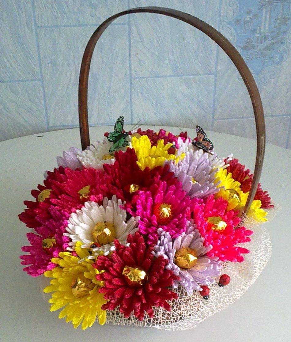Чтобы подарок не казался простым, при возможности можно смастерить сладкий букет в корзинке или красивом горшочке.