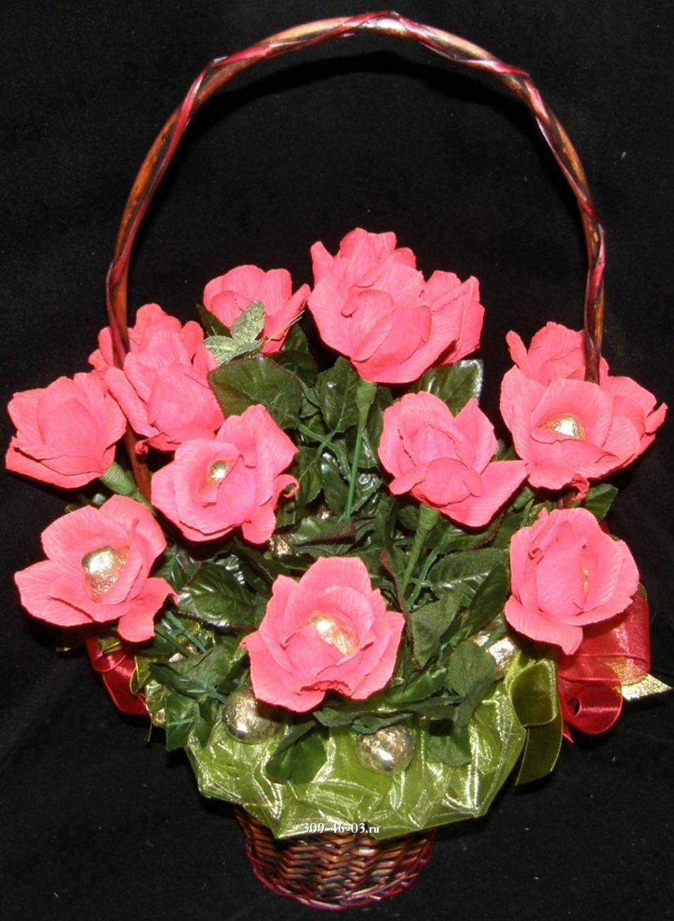 Розы – популярные цветы. А корзина роз из конфет удивит и порадует того, кому будете его дарить не меньше, чем живые розы.