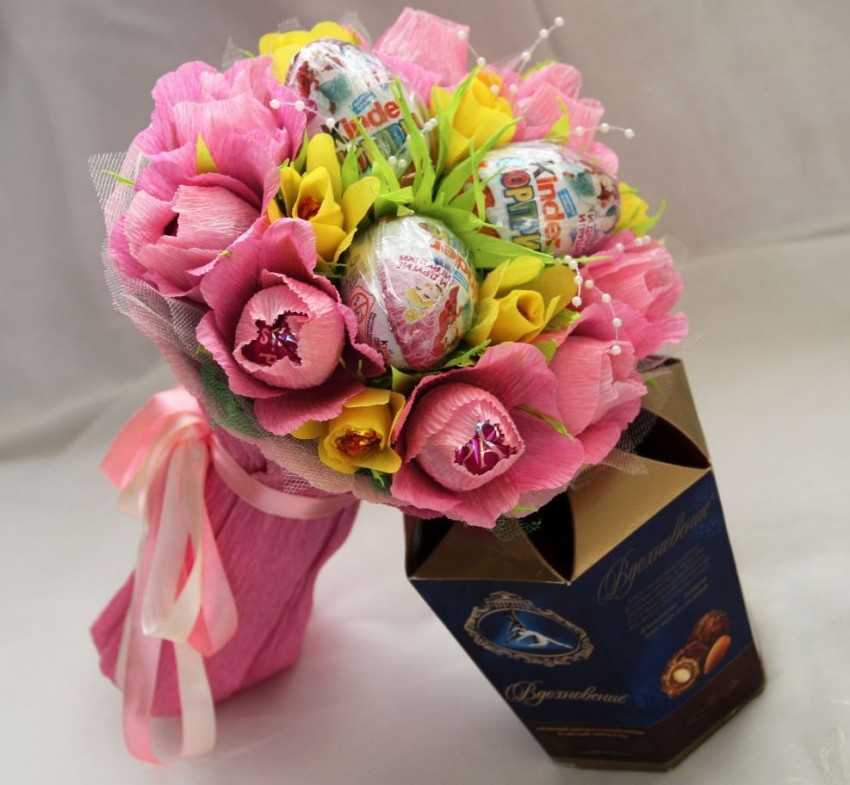 Из шоколадных конфет в разноцветных обертках можно своими руками произвести на свет настоящее чудо искусства. Чудодейственным мановением рук мастера и полетом его фантазии, вкусные конфеты превратятся в большие и маленькие бутоны роз, тюльпанов и других цветов. А от того каким образом их оформить будет зависеть конечный продукт. Вариантов множество. Их можно выложить в шкатулку, корзинку, соорудить своими руками красивую вазу или же оформить интересный топиарий к Пасхе, Рождеству или Новому году.