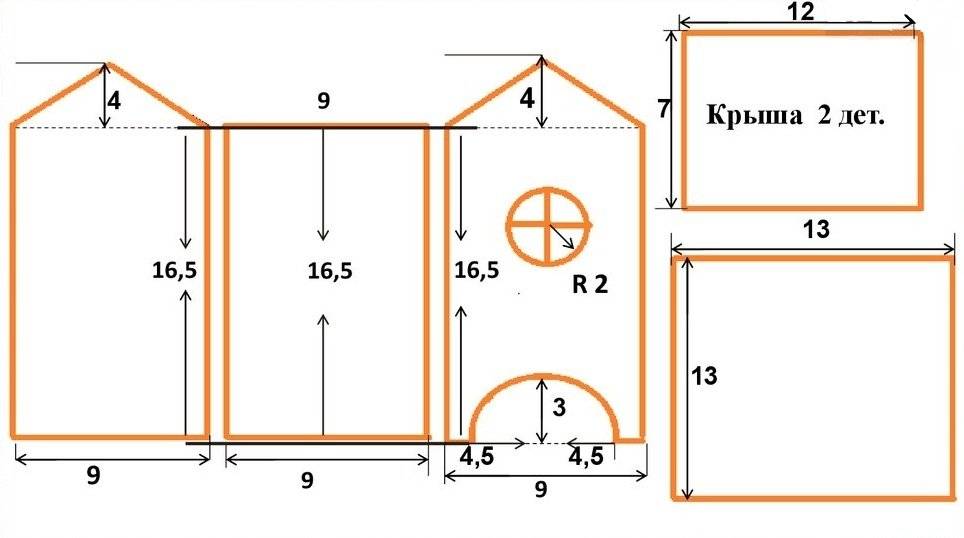 Другие две будут иметь другую форму. К первой форме стен (16,5*8,6) нужно сверху пририсовать треугольник высотой 4,3 см. На одной из двух таких деталей нарисовать окно (можно использовать в качестве трафарета что-нибудь круглое и подходящее по размерам), а можно и воспользоваться циркулем. Также рисуем «дверь» нашего домика, через которую будут браться чайные пакеты.