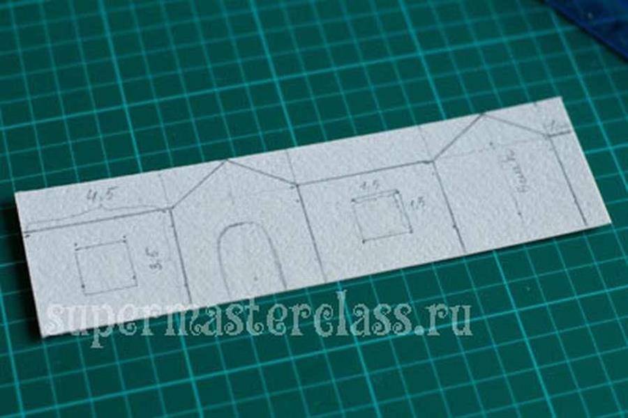 На плотной бумаге следует нарисовать при помощи линейки и карандаша дом в развернутом виде.