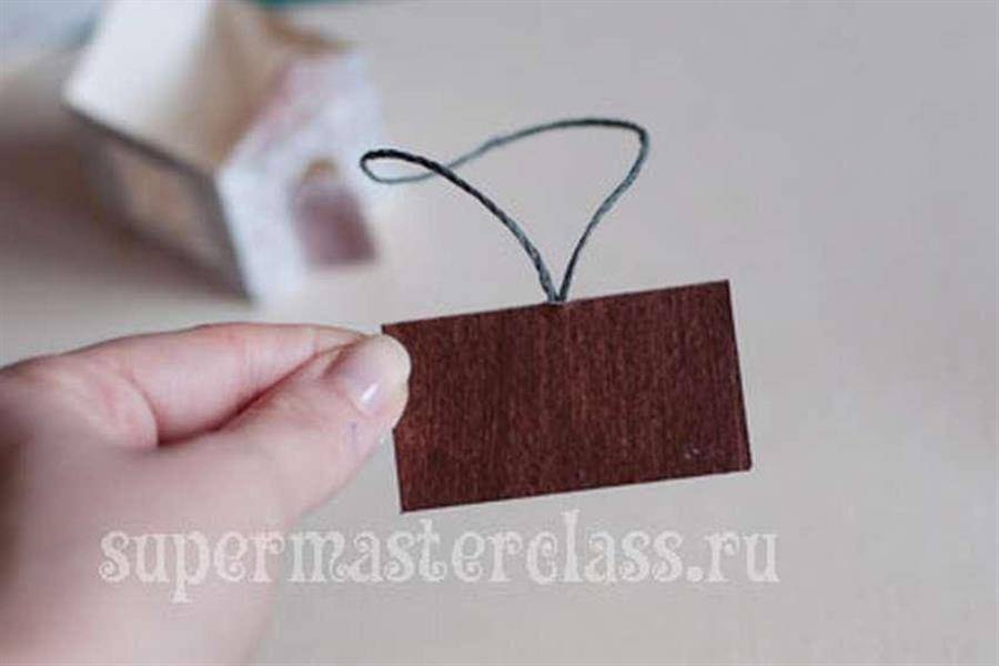 В середине крыши проделайте отверстие и протяните в него верёвку так, чтобы получилась петля. Концы скрутите в узелок.