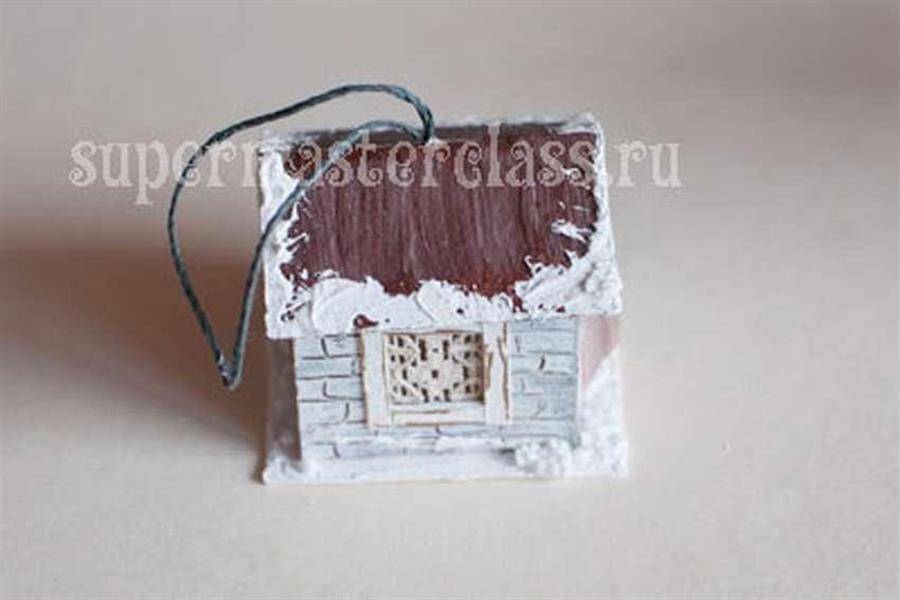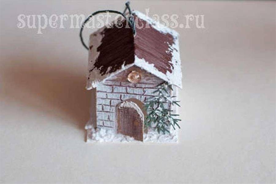 Белой краской изобразите снег на крыше, внизу приклейте пенопласт. Сам домик украсьте еловыми веточками, из страз можно сделать фонарь над дверью. Ваше волшебное уютное украшение не останется незамеченным среди множества других игрушек.