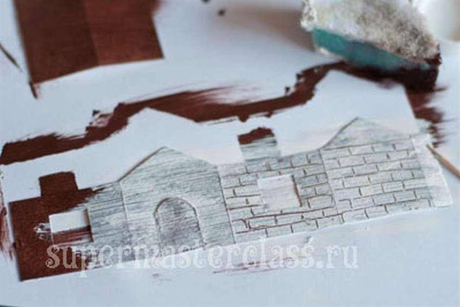 С помощью губки покрасьте домик и крышу в коричневый цвет. После высыхания пройдитесь по стенкам ещё и белой краской. Не нажимайте сильно на губку, коричневая краска должна слегка проступать. Когда краска высохла, нарисуйте кирпичики на стенах.