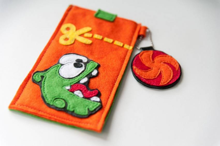 Сначала приступаем к изготовлению выкройки. Телефон прикладываем к бумаге и обводим его по контуру. К данной величине прибавляем 2-3 сантиметра на припуск. Чем толще телефон, тем больше припуск делайте. Получившуюся выкройку переносим с бумаги на ткань и вырезаем две одинаковые детали. Далее переходим к изготовлению аппликации – сделаем на чехле милого котенка. Рисуем изображение котенка на бумаге, затем делаем выкройку силуэта на фетре и вырезаем. К аппликации также вырезаем глазки бежевого цвета и носик коричневого цвета и приклеиваем клеем момент и затем прошиваем. Нитками мулине вышиваем котику ушки, ротик. Готовую аппликацию приклеиваем к одной части чехла и прошиваем. По желанию можно пришить к чехлу милые сердечки или пуговки. Все зависит от вашей фантазии и предпочтений. Затем складываем две части чехла и прошиваем нитками мулине в тон петельным швом. Оригинальный и модный чехол из фетра для телефона своими руками готов.Для планшета. Планшет является не менее популярным гаджетом, чем телефон. Его легко можно взять с собой вместо компьютера, но он очень уязвим к царапинам и падениям. Для того что бы избежать этих неприятностей, сошьем чехол из фетра для планшета.