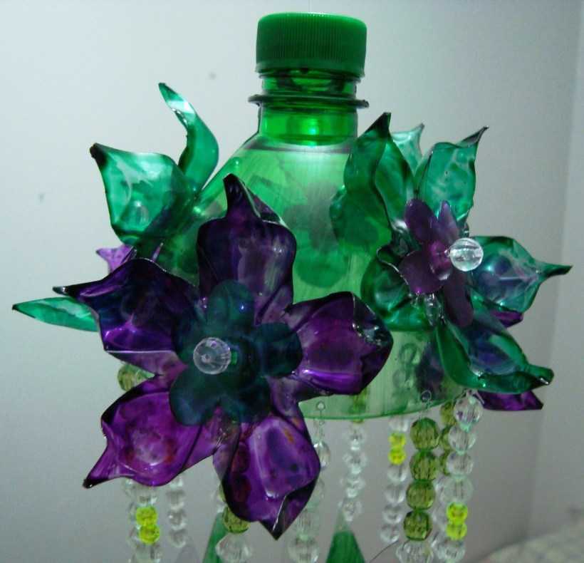 Здесь подойдут бутылки разных размеров, для цветочков пригодятся донышки, а из самой бутылки можно нарезать листиков. Нарезанные цветочки и листики можно покрасить, можно оставить прозрачными. Нужно нанизать их на нитку и повесить в садовом доме, в беседке, на веранде, даже в предбаннике.