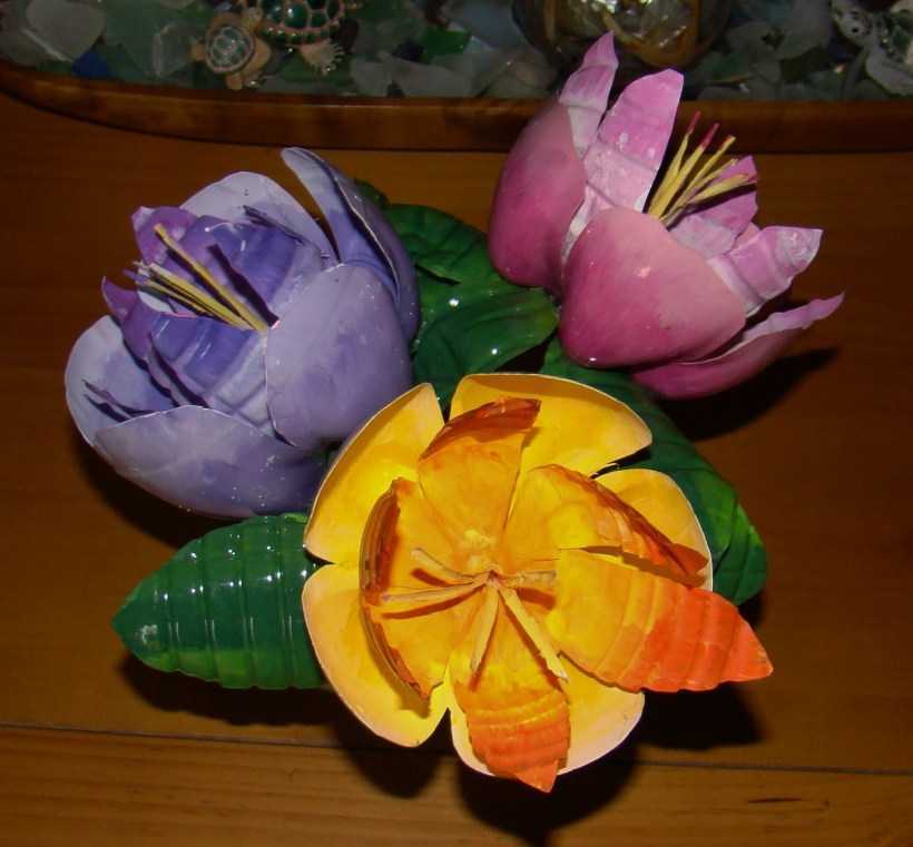 Пластик под воздействием высокой температуры обретает неповторимые формы. Для соединения «лепестков» используется клей для пластика. А дальше – уже работа фантазии.