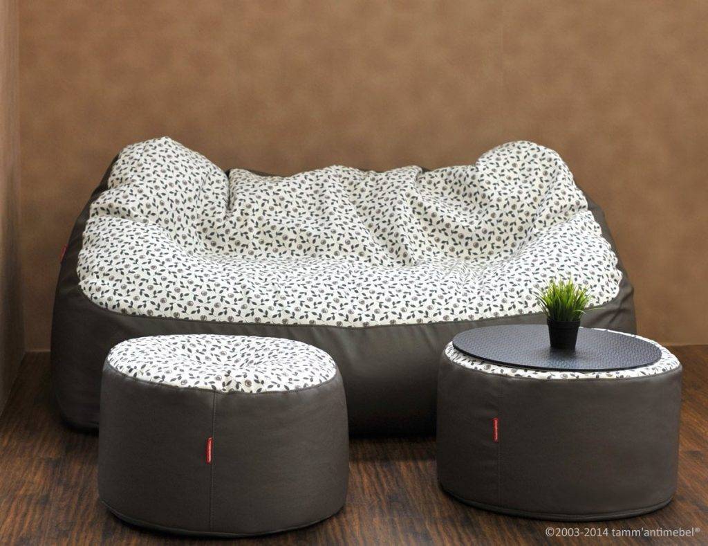 - Бескаркасная мебель. Диван-пуф, кресло-мешок или «шайба», пуфы или напольные подушки подходят и для гостиной, и для спальни.