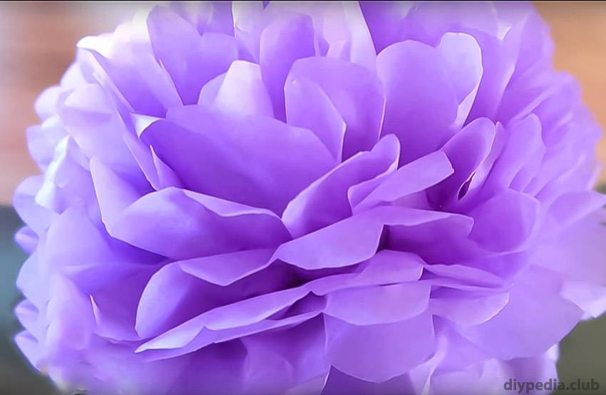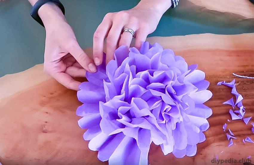 7. Если вы купите готовые цветы помпоны из тишью, то вам дадут именно такую заготовку, которую теперь нужно открыть, сформировав цветок следующим образом: начиная с самого верхнего, поднимайте все слои бумаги к середине.