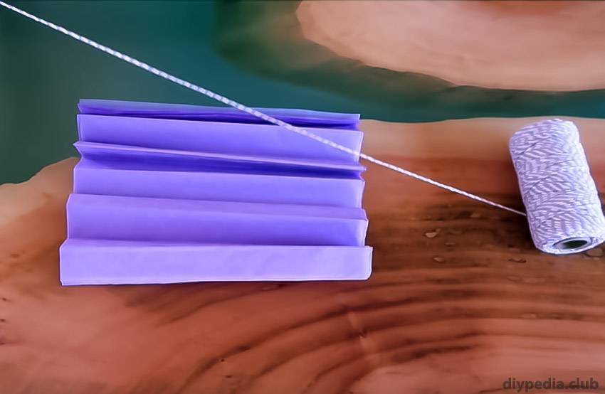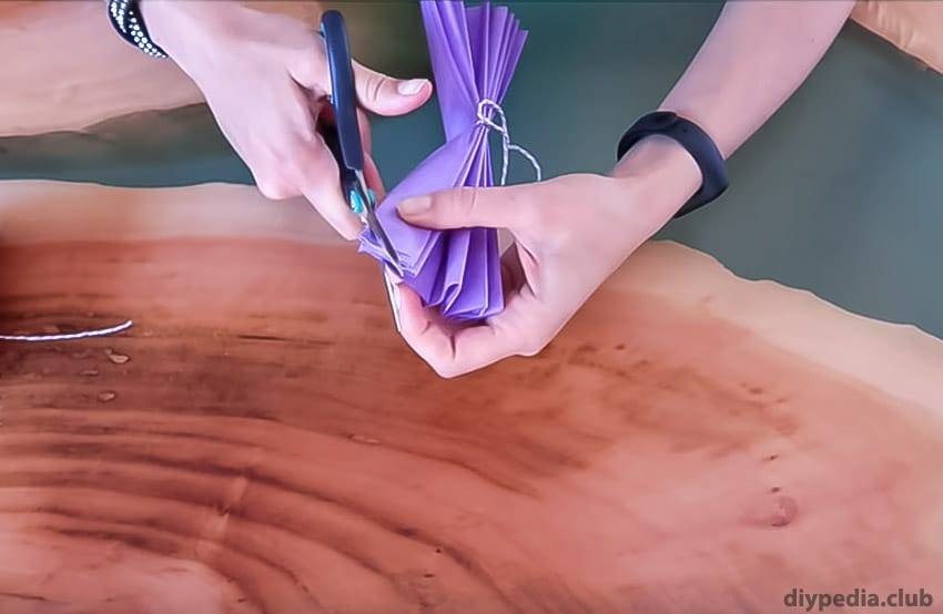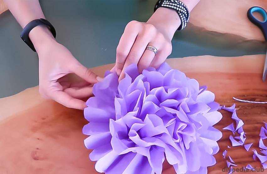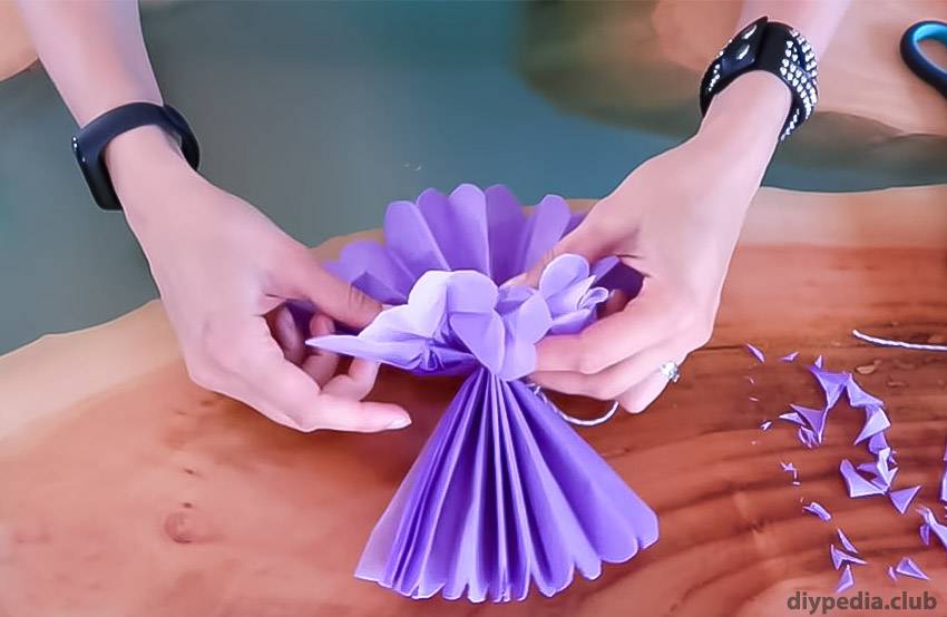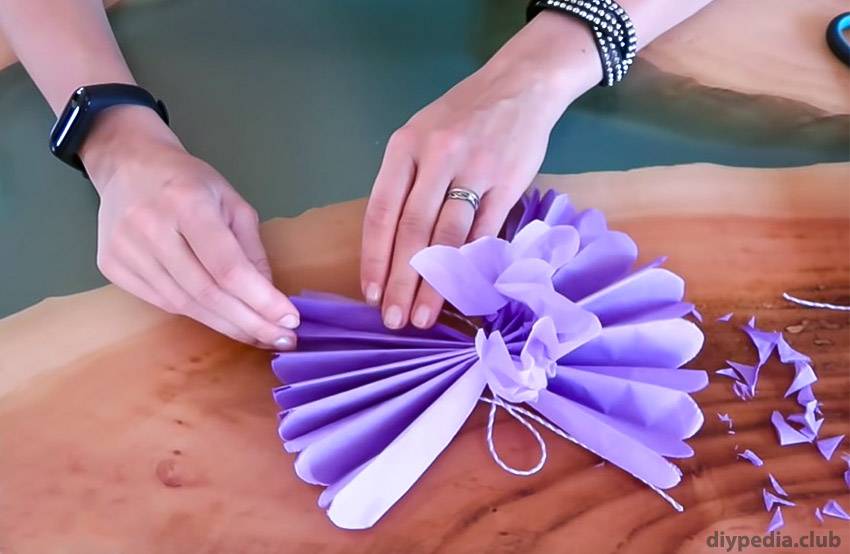- Снова всё собираем в гармошку. Перевязываем в центре ниткой, чтобы получился бант. Начинаем отделять слои, как мы это делали в прошлой инструкции. Придаём цветку пышность.