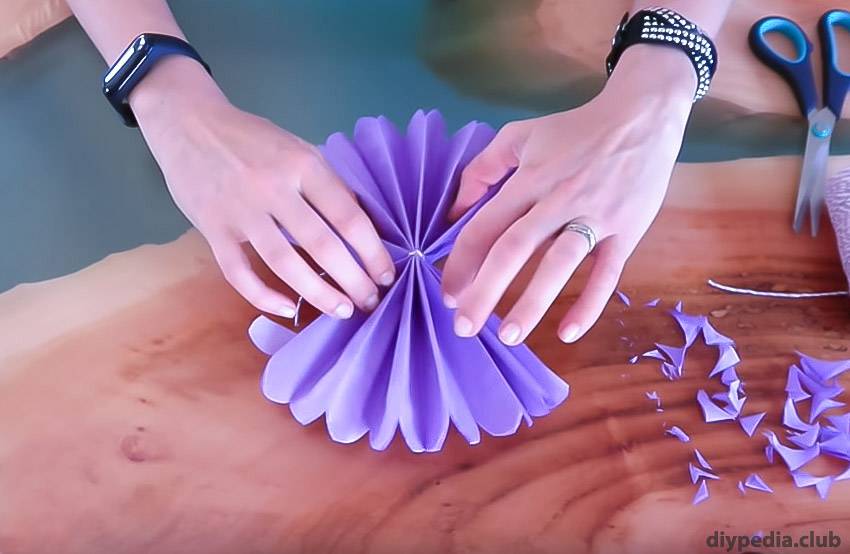 - Подсушенные бумажные заготовки сворачиваем «гармошкой» и аккуратно делаем складки на лепестках, сжимая их пальцами.