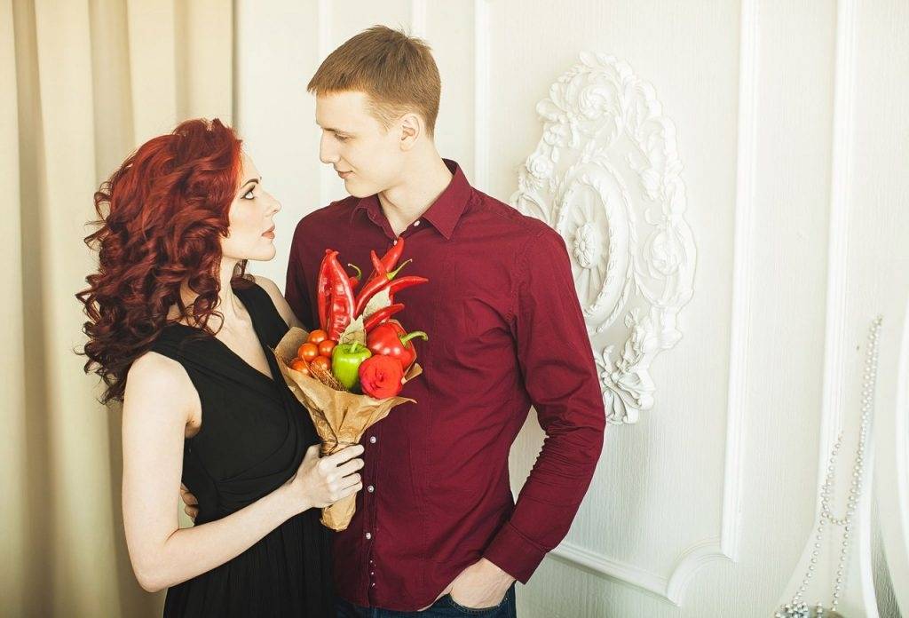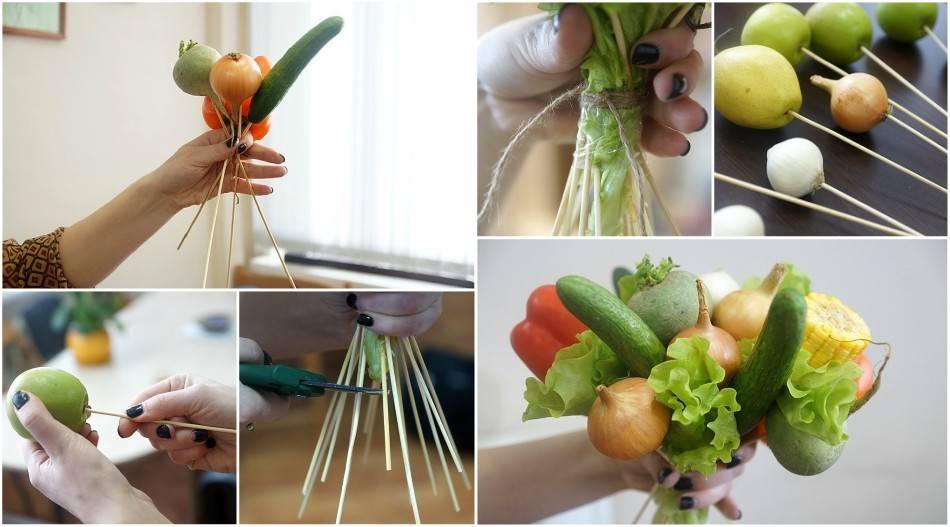 Другой вариант — букеты-натюрморты из фруктов и овощей, они смотрятся экзотично, но так кстати находят свое место на праздничном столе.