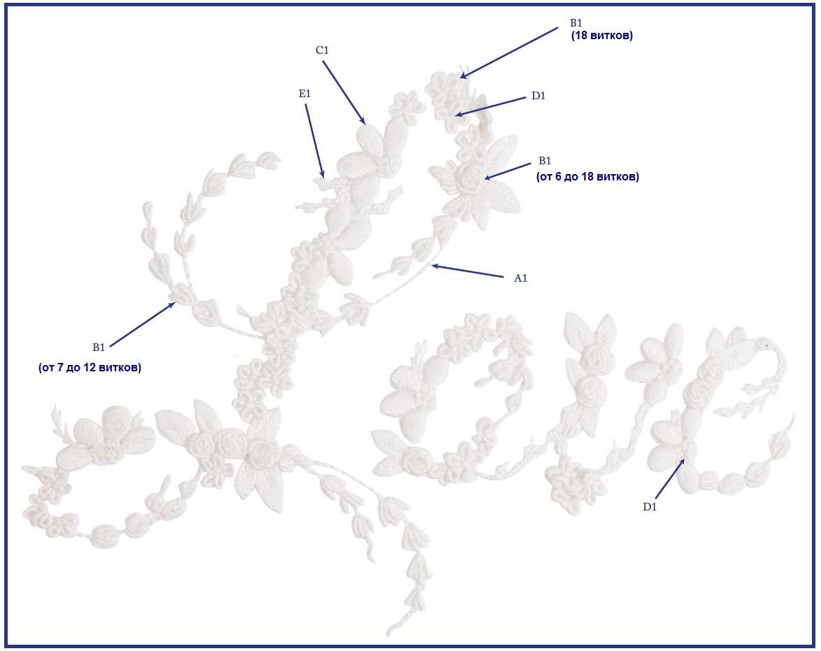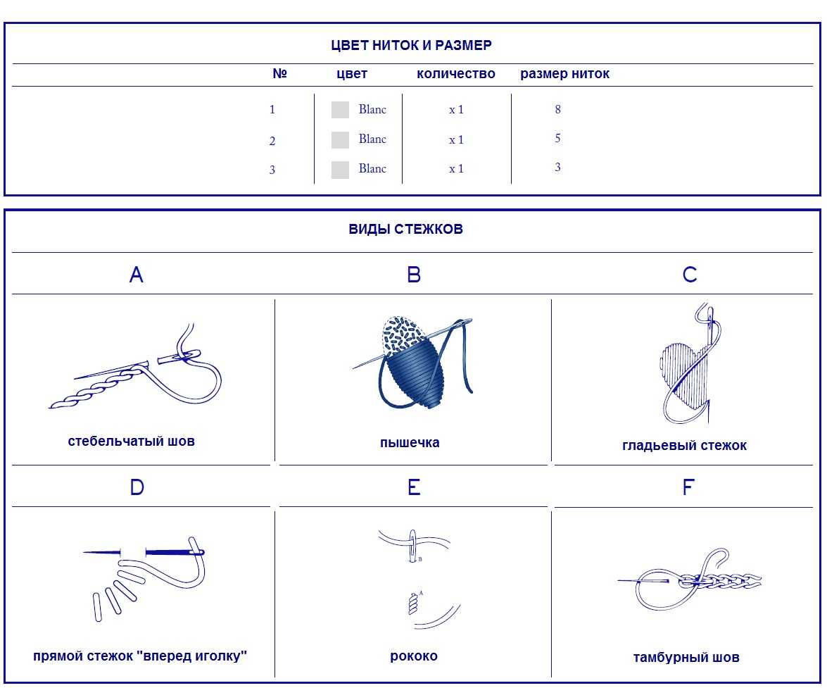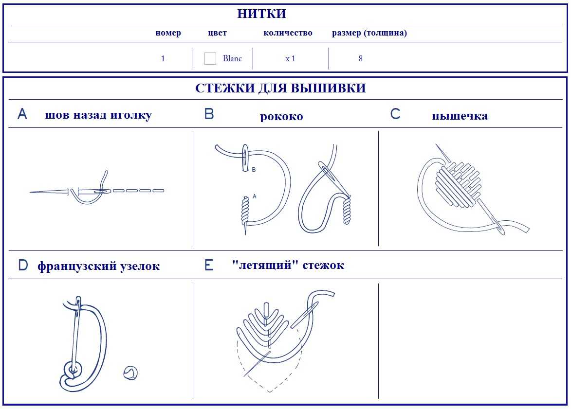На схеме буквами указаны виды швов, ну а цифрой – цвет ниток (белый).