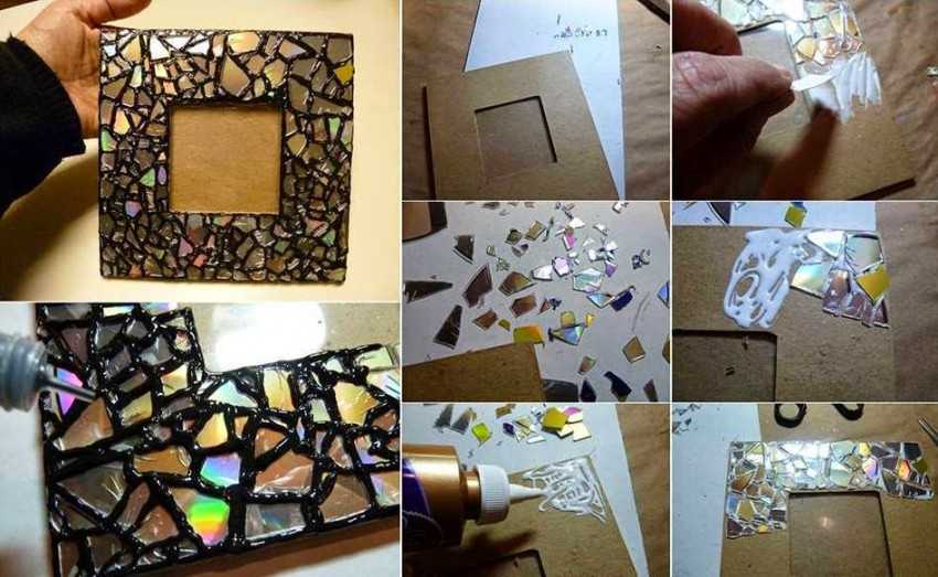 Каждую деталь из картона склеивают друг с другом, формируя место для вставки зеркала. Когда рама для зеркала крепится к толстой основе, прошлые пункты руководства опускаются.
