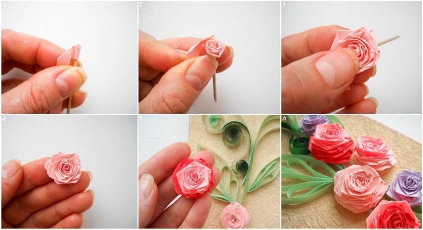 Ножницы ведите спиралью, полученные лепестки туго скручиваете. После их высвобождения из жгута получите раскрывающийся бутон великолепной розы. Её приклеиваете на планшете. Можете формированием розы поупражняться с гофрированной бумагой.