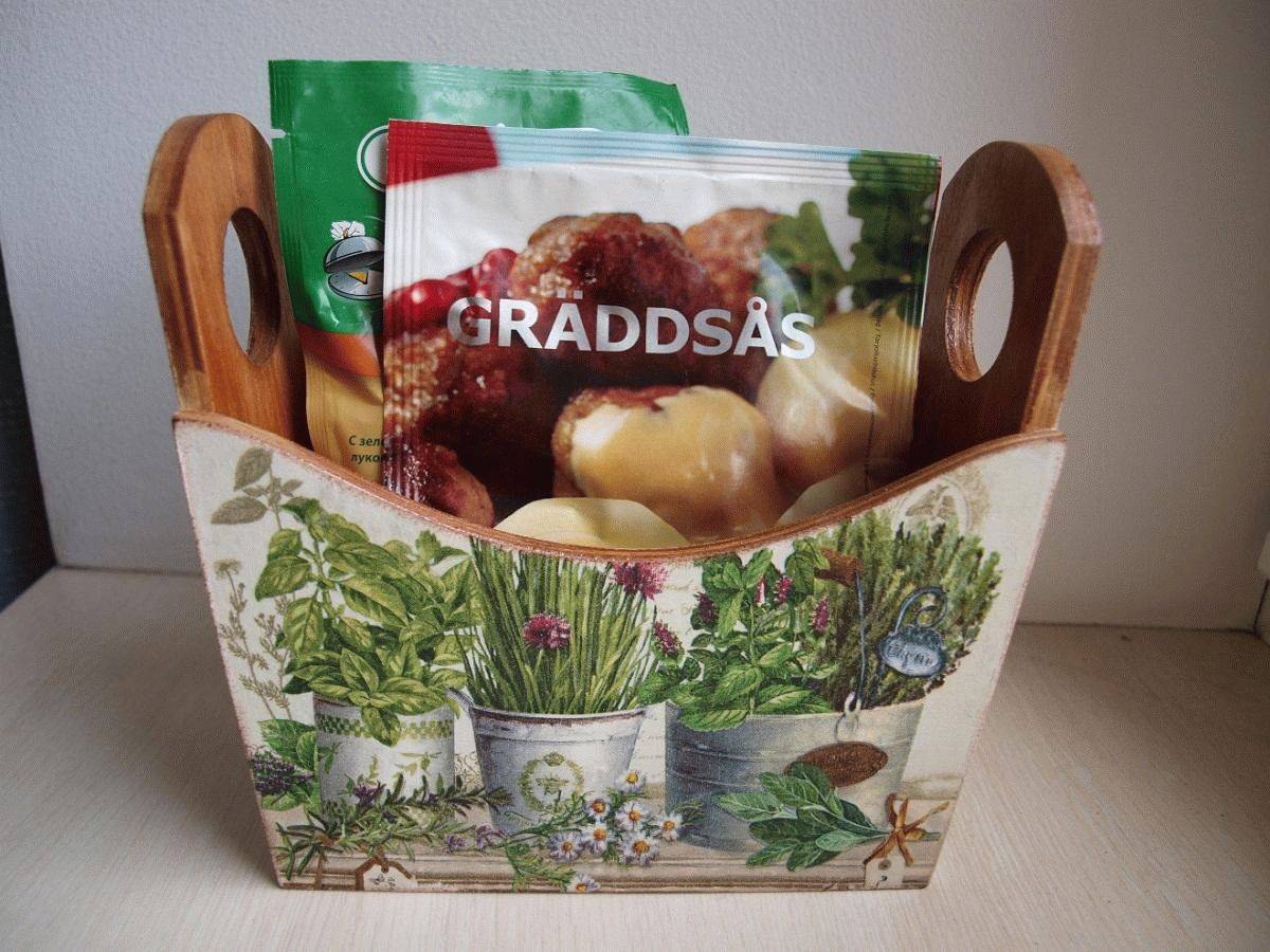 На картон очень хорошо ложатся декупажные салфетки. Если взять коробку из-под обуви и подключить фантазию, из ее можно изготовить неповторимую емкость для сыпучих продуктов, а также шкатулку для специй или для чая.