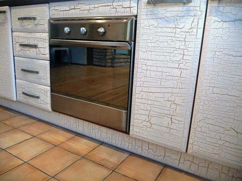 Кухонные шкафы покрывают яркими декоративными элементами или росписью. Создание эффекта потертости помогает придать изделиям состаренный вид.