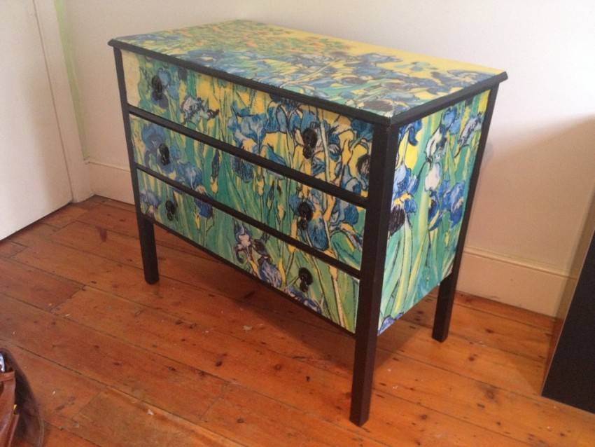 После того как рисунок приклеился, необходимо покрасить мебель акрилом, выбранного цвета. Для этого понадобится широкая плоская кисть, а наносить краску следует в одном направлении и удалять ее излишки салфеткой, чтобы не было подтеков и неровностей.