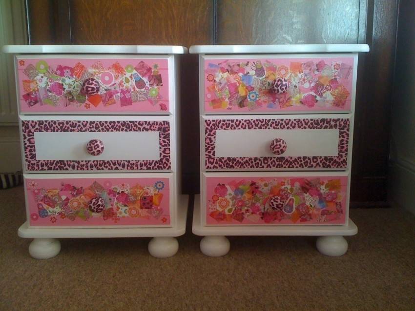 Перечень материалов для мебели ничем не отличается от тех, которые были перечислены в предыдущих мастер-классах. Очищаем поверхность старой тумбочки и выравниваем все шероховатости. Затем, красим ее в заранее выбранный цвет краски несколькими слоями. Ожидаем высыхание каждого яруса. Для декупажа используйте карты или салфетки. Из них вырезаем подходящий мотив ножничками. Подобрав наиболее удачный ракурс на предмете, наклеиваем картинки. Клей должен быть качественным. Потому что плохой клей со временем пожелтеет. Если вы выбрали карты, тогда клей наноситься на обратную их сторону. Если же это салфетки, тогда клей будет наноситься поверх изделия. Чтоб избавиться от пузырьков и складок, проведите по картинкам отрезом чистой ткани. Такие манипуляции делаются до того времени, пока вы не убедитесь, что изображение нанесено ровно и идеально. На этом мастер-класс можно закончить. Для разнообразия посмотрите видео того, как делают декупаж тумбочки и другой мебели более опытные любительницы такого мастерства.