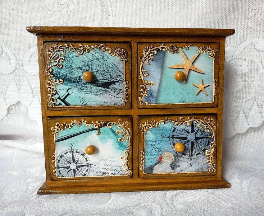 Придерживайтесь такого мастер-класса для декупажа небольшого шкафа своими руками: