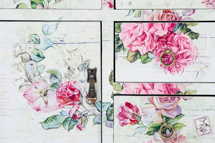 - Теперь можно приступить к нанесению узоров на поверхность мебели. Для этого возьмите салфетки с цветами, уберите верхние два слоя бумаги, оставив лишь тот, на котором находится изображение. Подготовив нужное количество мотивов, приложите их к шкафу и продумайте, насколько хорошо они будут смотреться в выбранном месте. Учитывайте свойство бумажных салфеток растягиваться при наклеивании на твердую поверхность.
