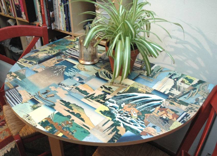 ЭтапМатериалы и инструментыРезультатПодбор материаловБумажные обои, клей ПВАПодобран стиль выполнения, основа с понравившимся изображением, дополнительные инструментыПодготовка поверхностиНаждачная бумага, шпатлевка, растворительУдалены все остатки краски, поверхность гладкая, обработана шпатлевкой и готова к дальнейшему декорированиюПроизведение замеровРулетка, нож канцелярский, карандашПроизведены замеры рабочей плоскости, отрезано полотно материала в соответствии с замерамиОсновная частьИзображение, клей ПВА, вода, валикНа поверхность приложены обои, покрыты слоем раствора воды и клея, разровненыВскрываем лакомЛак для дерева, кистьВысохший рисунок покрыт лаком