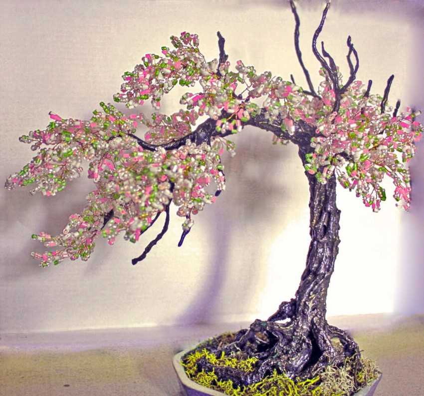 - Изюминка этой сакуры состоит в эффекте натуральности ствола и основания деревца, а также в том, что веточки сформированы из густо расположенных продолговатых петелек из розового бисера.