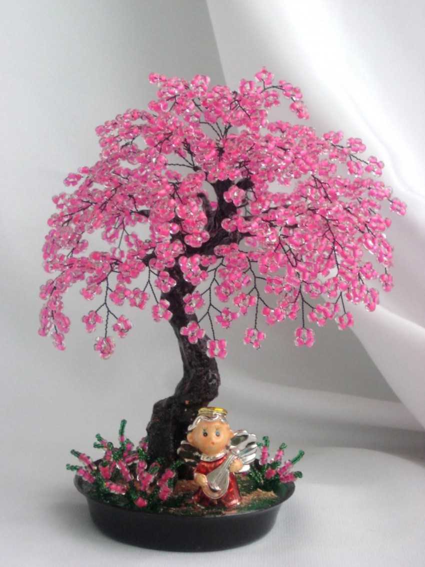 - Если помимо рукоделия вы увлекаетесь фен-шуй, то предлагаем сделать вот такую композицию с цветущей сакурой из бисера, натурального камня и фигурки китайского божка. Такое дерево сакуры не только украсит ваш интерьер, но и станет отличным подарком для друзей.