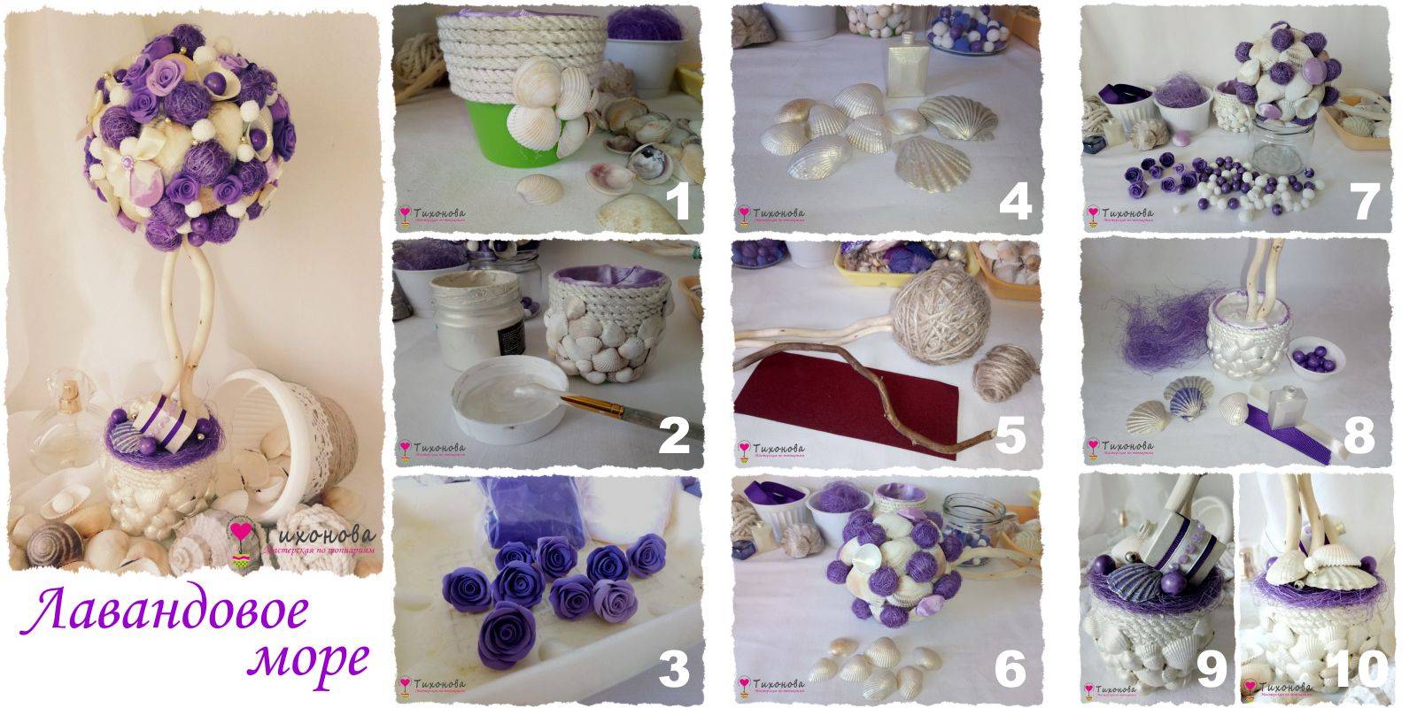 Подробный мастер-класс — топиарий «Лавандовое море» с фото и видео: https://topiarii-mk.ru/derevo-iz-rakushek-topiariy/.
