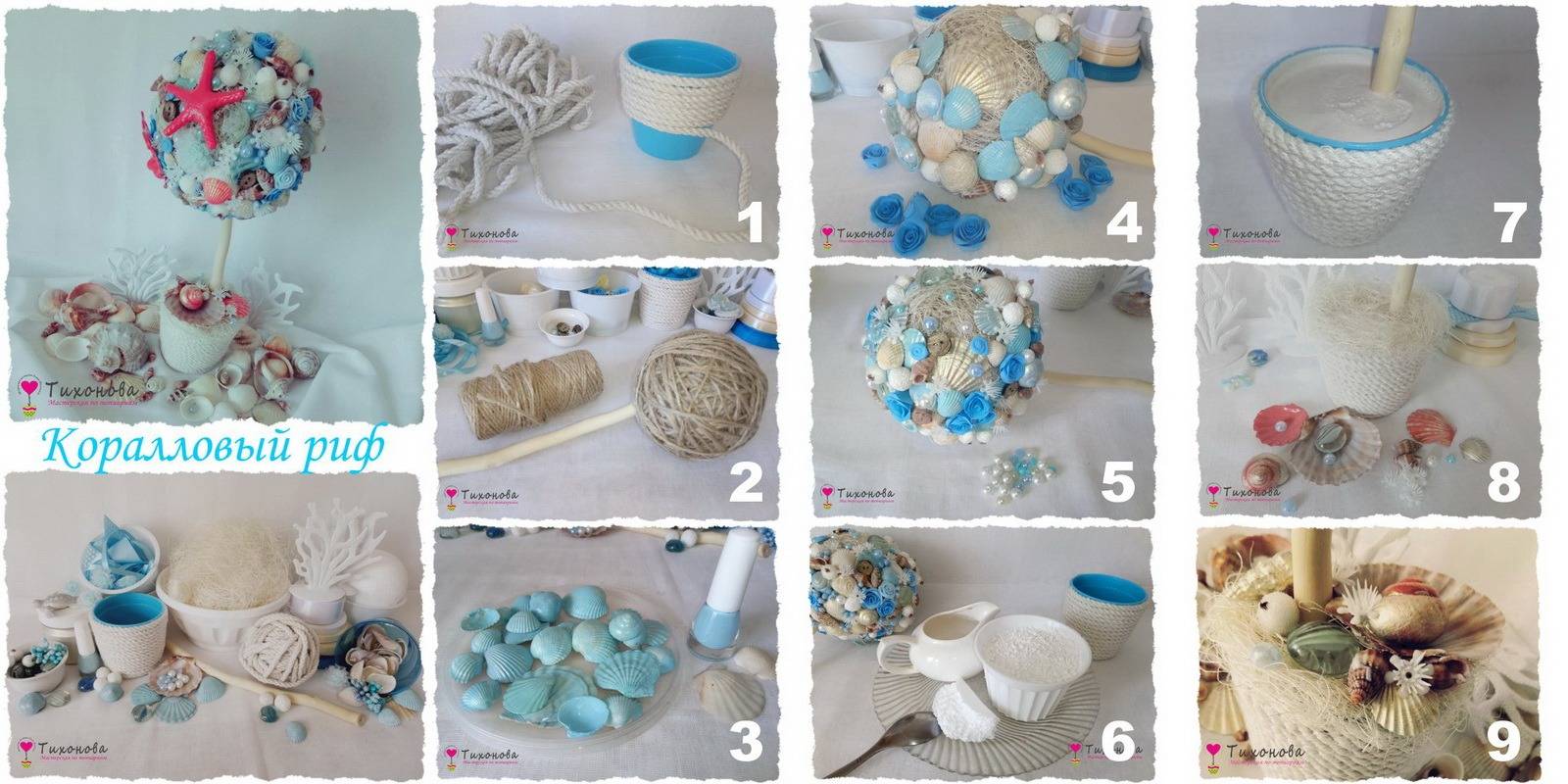 Подробный мастер-класс — морской топиарий «Коралловый риф» с фото и видео: https://topiarii-mk.ru/topiary-iz-rakyshek/.