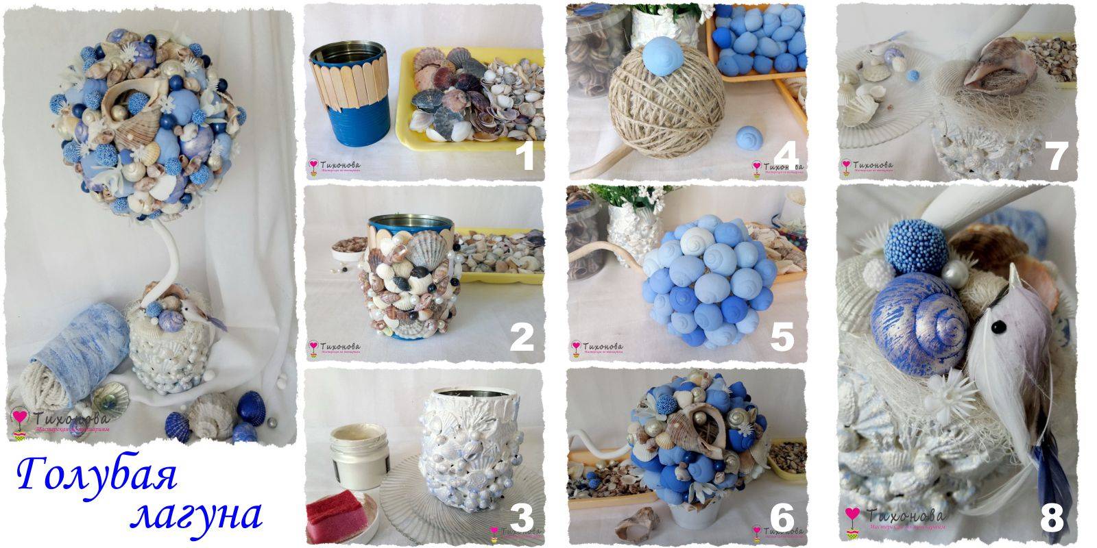 Подробный мастер-класс — дерево «Голубая лагуна» с фото и видео: https://topiarii-mk.ru/morskoi-topiariy-laguna/.
