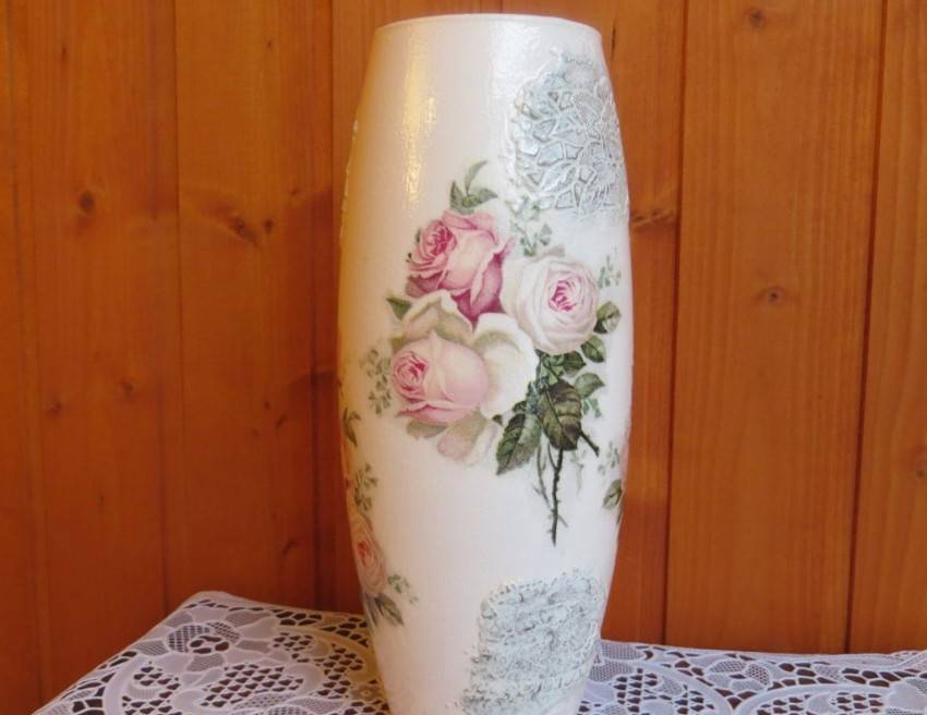 Она приклеилась, теперь все кусочки один за другим приклеивайте таким же способом, по пути можете сделать бутоны розочек из салфеток и также их приклеить на клей.