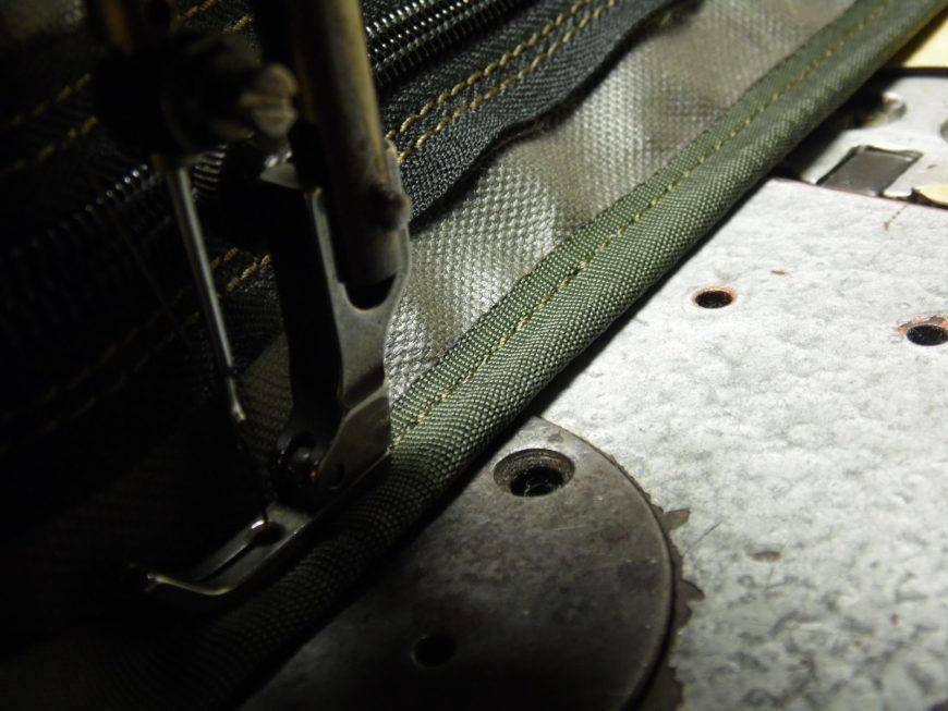 Внутри располагаем хлопковую ткань, сшивая её на мессе швов джинсовой ткани и по краям сверху с каждой стороны.