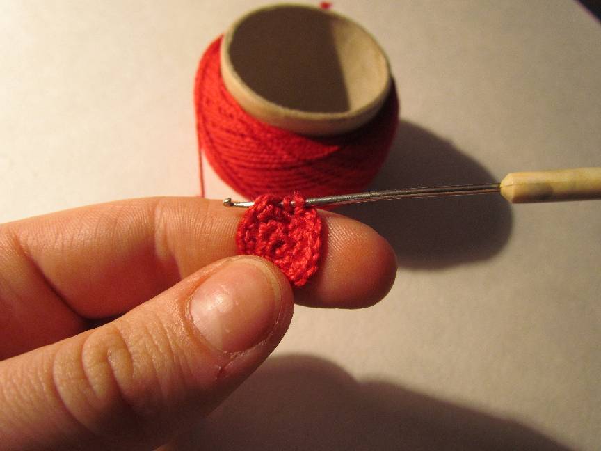 - Для оформления носка следка провяжите сначала белыми нитками. Сделайте кольцо, вывяжите из кольца 3 ВП подъема, потом 11 СН. Закончите Р: соедините С в 3 ВП подъема. Снимите кольцо, потяните за кончик нитки, закрепите ее с изнаночной стороны.