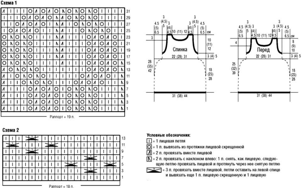 Набираем на спицах 63 петли, провязываем 4 ряда платочной, затем вяжем лицевой гладью 20.5 см. Следующий ряду, каждую 2- ю и 3-ю петлю вместе одной лицевой. Оставшиеся 42 п. начинаем вязать платочной вязкой, Связав 4 см, закрываем по 4 п. с двух сторон для проймы, затем для ее формирования закрываем 4 р. через ряд по 1 петле. Когда останется 26 петель, которые вяжем еще 3.5 см, затем закрывает 14 центральных.