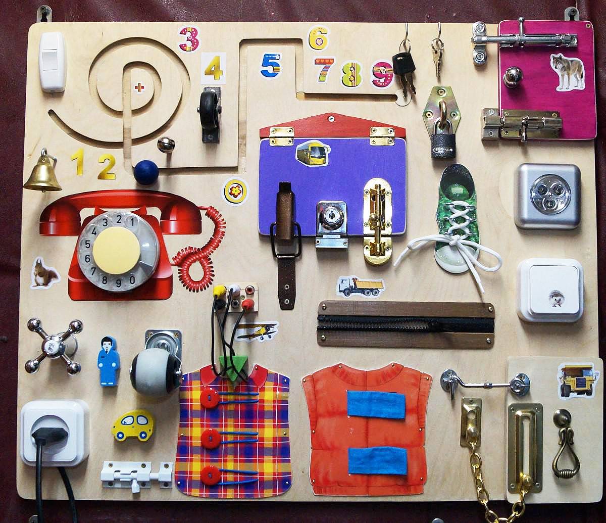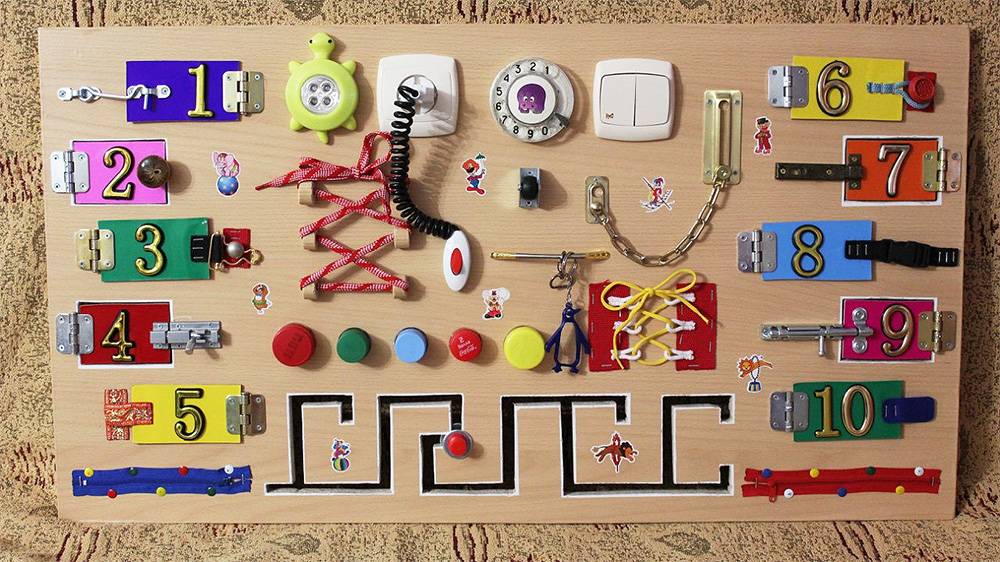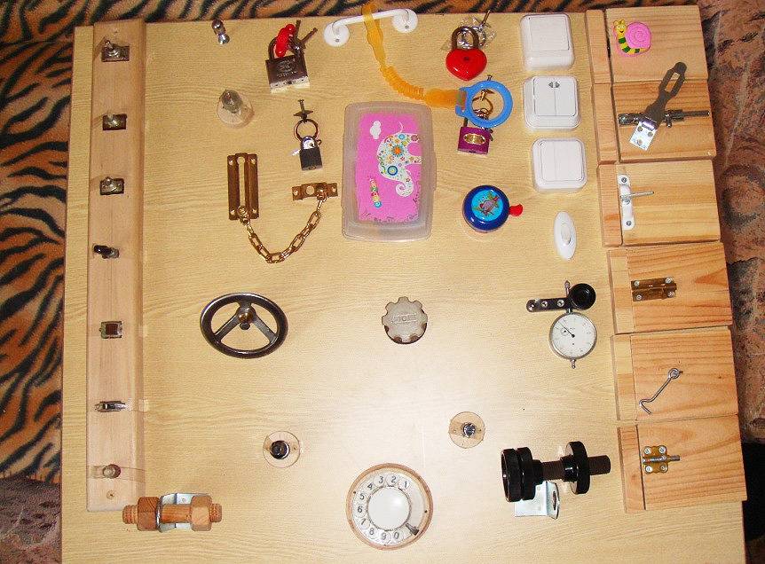 Совет. Для создания развивающей доски вы можете использовать все что угодно — то, что будет вращаться, щелкать, перемещаться и светиться. Вы вынесете все, что вызывает интерес в квартире, на одну компактную поверхность, и этим и заинтересуете, и обезопасите малыша от неприятных последствий «свободных исследований».