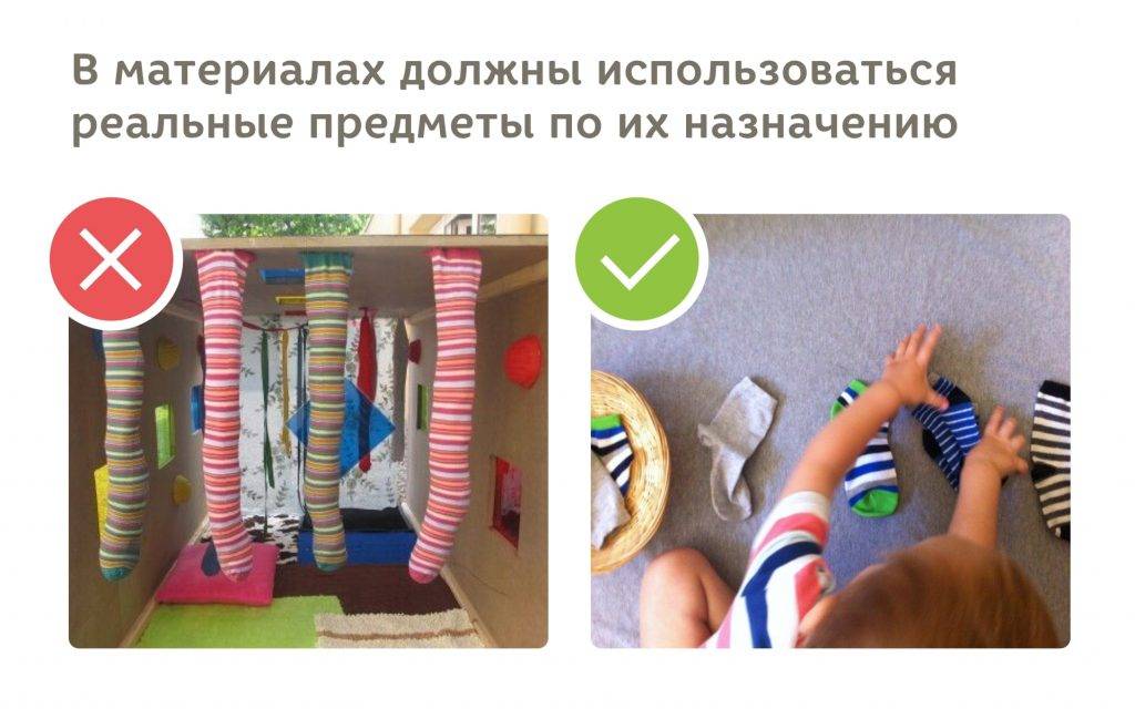 Нам кажется, что чем сложнее материал и чем мы изобретательнее, тем лучше. Поэтому делаем огромные доски со всеми возможными замками, но запрещаем ребёнку открывать и закрывать крючок на двери. Мы шьём рамки с пуговицами, но не даём малышу потренироваться на собственной одежде, делаем материал с прищепками, но не даём развесить постиранное, создаём множество сенсорных материалов, забывая, что самый богатый сенсорный опыт малыш получает из внешней среды постоянно, особенно на прогулках.