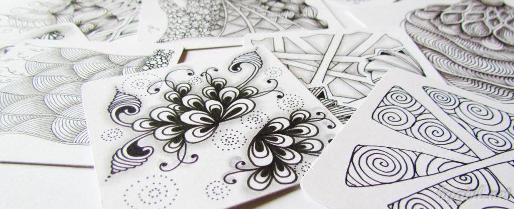 Зентангл похож на дудлинг, но требует более высокой концентрации. Квадрат делится на сегменты и каждый сегмент заполняется разными элементами. Считается, что зентангл помогает сконцентрироваться и успокоиться.