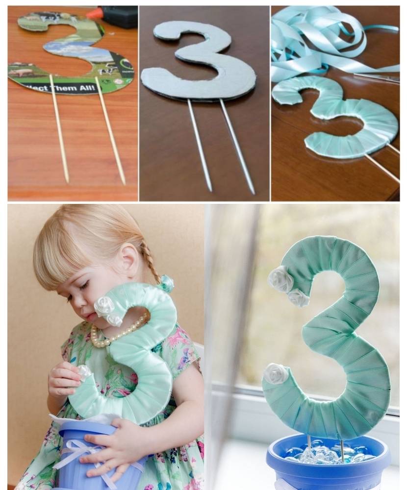 В качестве украшения для цифры подойдет все, что угодно. Только бы смотрелось красиво и празднично. Можно изготовить бумажные цветочки, можно оклеить цифру пуговками, или пошить небольших зверушек из фетра и закрепить их на цифру.
