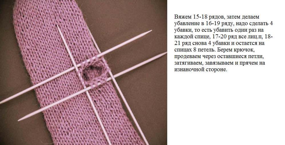 Доходим до высоты 6 (7) см. от резинки и начинаем убавки.