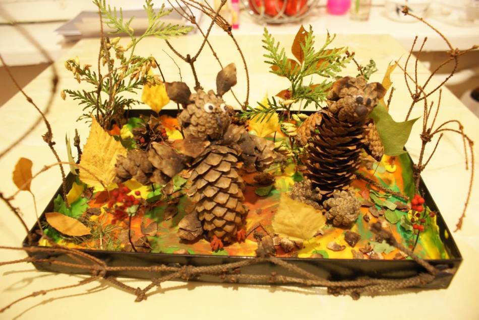 Из материалов, которые преподносит осень, можно изготавливать различные композиции совместно с детьми. Это будут абсолютно бесплатные поделки из подножного сырья, но ценность их будет состоять в тепле отношений взрослого и ребенка. Кроме моральной пользы, такое времяпрепровождение полезно для детей и физически: развиваются мелкая моторика рук, что нужно для речи, сенсорные способности, воображение