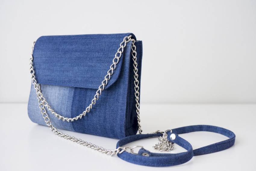Клатч из денима будет состоять из одной цельнокройной детали, которая представляет собой лицевую и заднюю сторону сумки, а также закрывающий клапан. Также понадобится выкроить две боковые части, чтобы добавить аксессуару объем, и пару деталей из подкладочной ткани и флизелина (они равны по размеру основной большой заготовке). После этого у всех частей выкройки обрабатываются швы и они собираются в единый аксессуар.