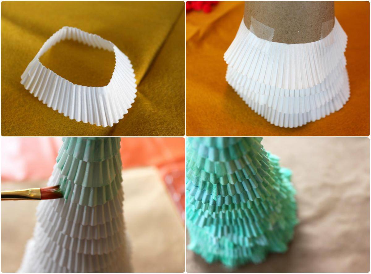 В качестве материала для елочки подойдут бумажные формочки для выпекания кексов. Если у каждой формочки обрезать бумажное дно, получается своеобразная юбка, которую и следует наклеить на картонную основу. Таким образом, после плотной поклейки и покраски формочек получается декоративная елочка, которую можно поставить на кухне.