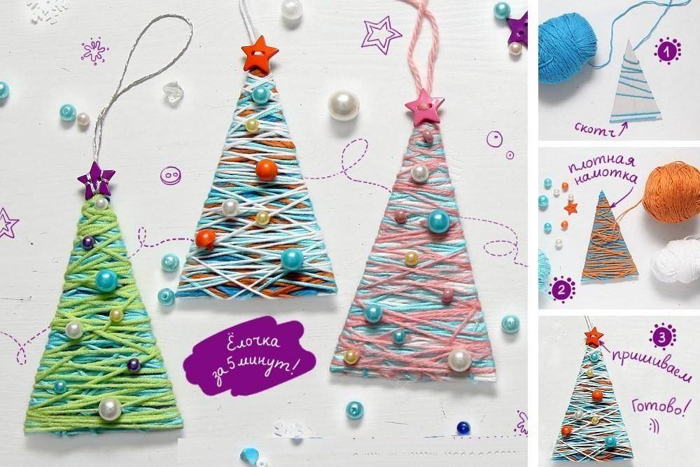 Фетр, пряжа, пуговицы, нитки и любые другие украшения, которые могут быть на елочке.