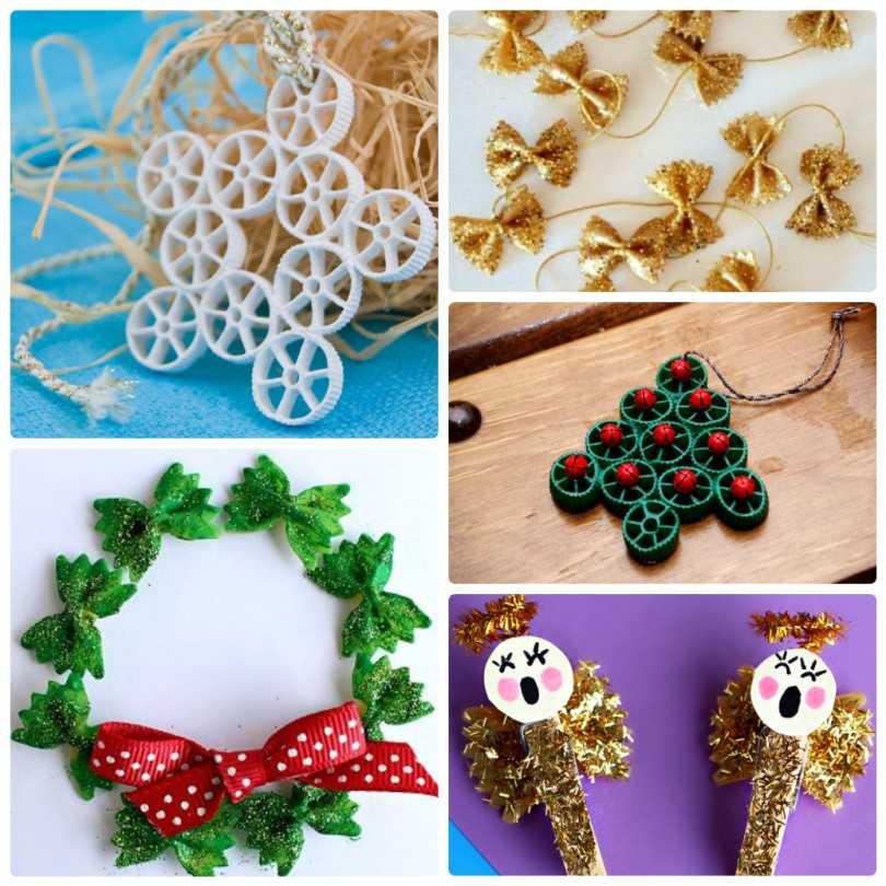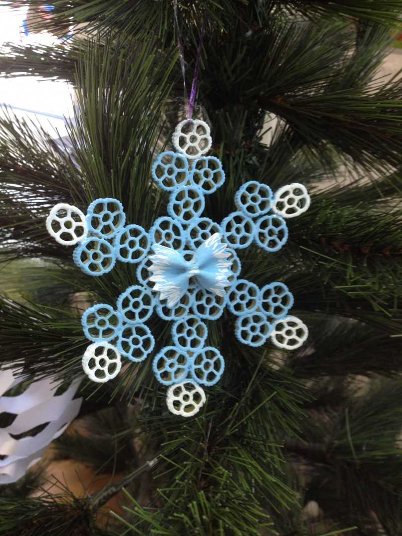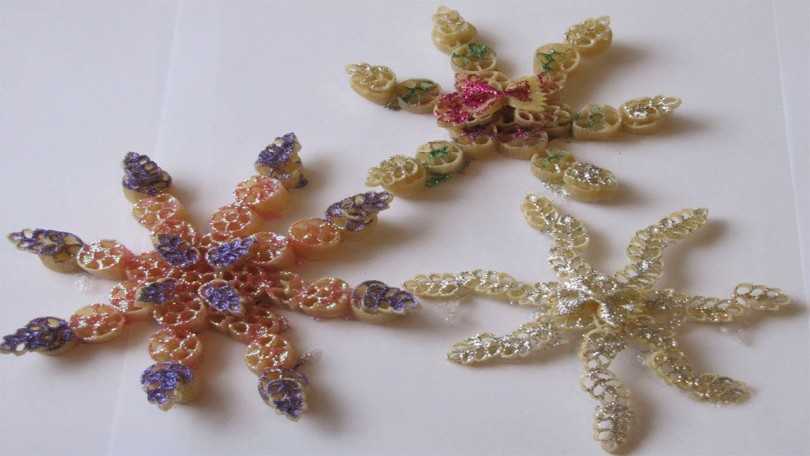 Шары – не единственное убранство. Очаровательные снежинки не менее прекрасны на елочных иголках. Вместе с детками запаситесь изумительными грациями, взяв в производство разные виды макарон. Их так много, что может получиться великолепное произведение.