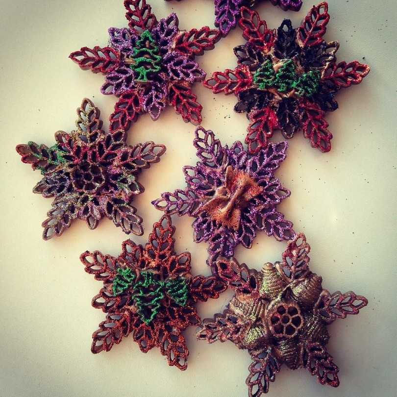 Для их декора можно использовать краски, блестки, лак, искусственный снег. В общем ничто не ограничивает вашу фантазию.