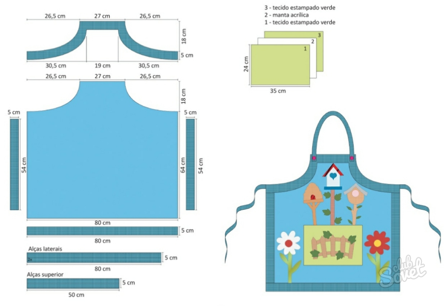 Важно! Не забудьте для боковых частей и верха фартука сделать окантовку подлиннее. Она будет служить завязками нашему изделию