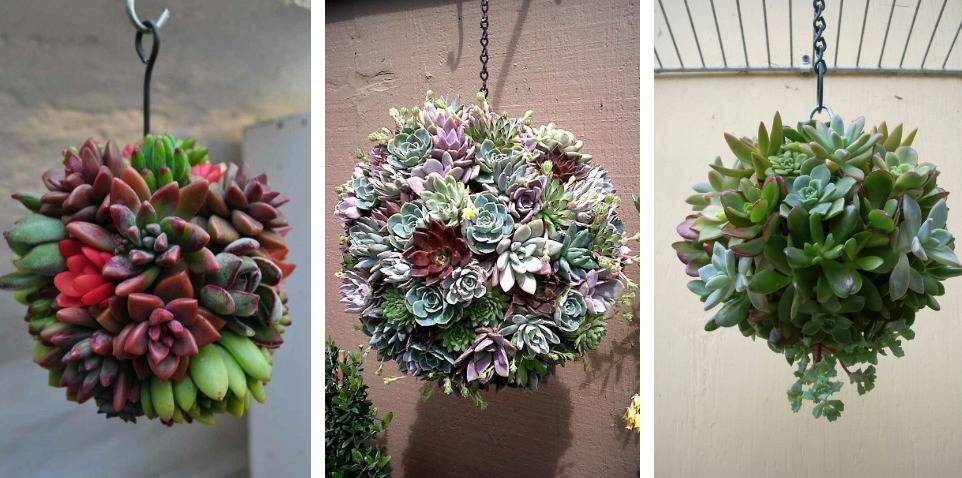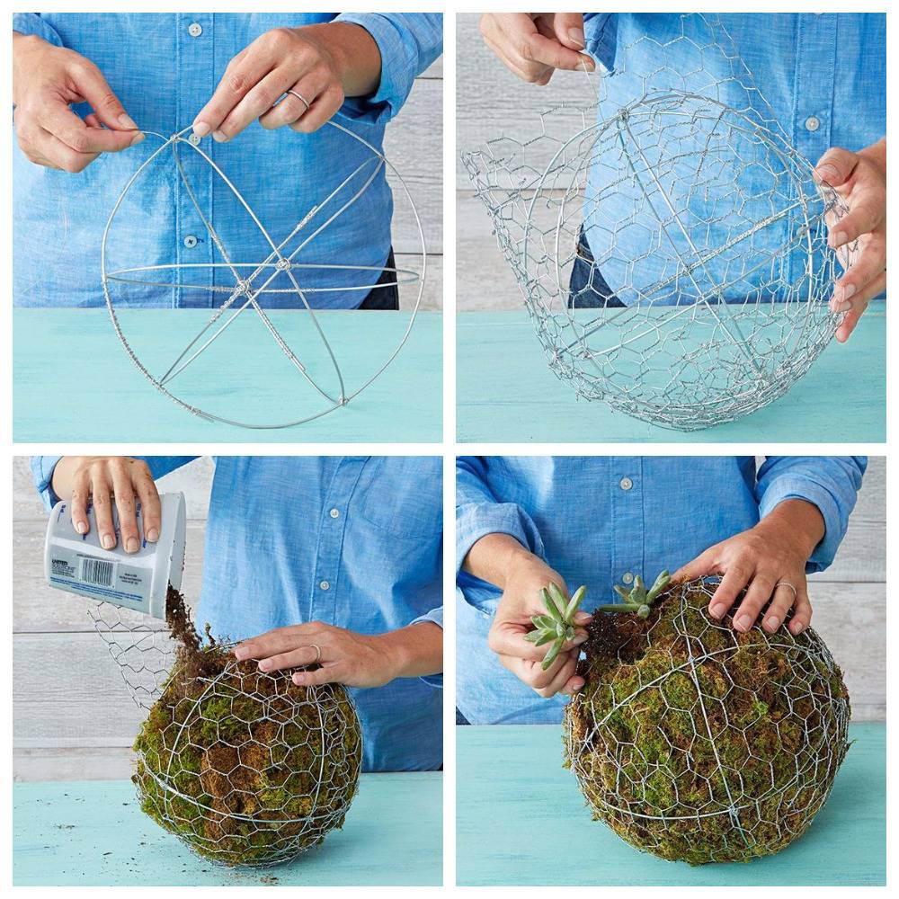 Изготавливается шар из проволоки диаметром…., обматывается все той же сеткой, но не полностью, следует оставить немного места, чтобы можно было рабоать с внутренней поверхностью шара. чтобы выложить поверхность очень толстым слоем мха и кокосового волокна, затем засыпается подходящий для суккулентов грунт, возможно, более рыхлый, в центр можно вставить пенопластовый шарик небольшого диаметра, чтобы исключить отсыревание и не сделать композицию слишком тяжелой. Закрыть сетку. Можно приступать к посадке растений.