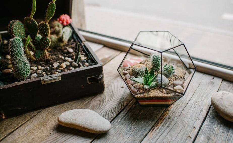 С недавних пор стало очень популярным сажать суккуленты и кактусы в стеклянные вазы — флорариумы. Сейчас без проблем можно приобрести разнообразные геометрические емкости в интернет магазинах, и даже флорариумы с уже готовыми композициями. Существует и более экономичный вариант — подыскать дома подходящий стеклянный сосуд и заполнить его по своему вкусу и желанию. Суккуленты прекрасно растут во флорариумах, это связано с защищенностью растения от сквозняков и перепадов температуры.