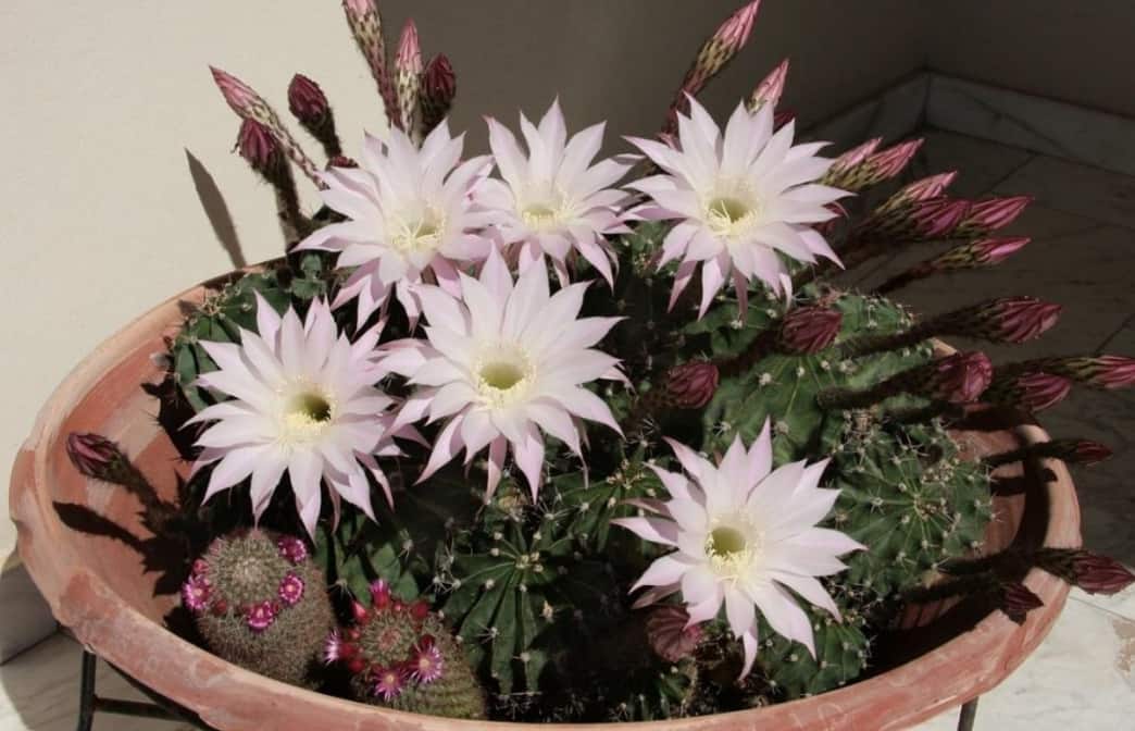 Эхинопсисы – молодые суккуленты обладают симпатичной шаровидной формы. Впоследствии вытягиваются или принимают вид столба. Однако, в ограниченном пространстве остаются привлекательными «шариками». Можно высаживать практически все популярные разновидности – острогранный, эйриеза, крючконосный, хуаша, хамецереусы и другие.